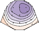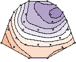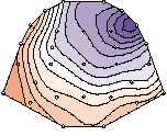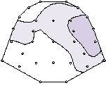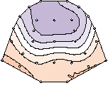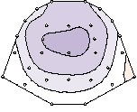 Fig. 2: Ignore condition, in-key chords. Grand-average potential map of the position-dependent amplitude effect which is suggested to reflect to buildup of musical context (difference-ERPs: chords from the fifth position subtracted from first position, view from top, interpolated over the time-window from 540-600 ms after stimulus onset; blue areas indicate negative potentials; all maps are presented with nose-reference).