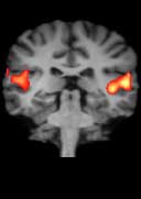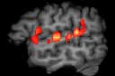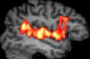 Statistical z-maps of the contrast between clusters and in-key chords. Effects of clusters (contrasted to in-key chords) are mapped onto an individual brain. The panel shows views from left sagittal (left, Talairach coordinate x=-52), coronal (middle-right, Talairach coordinate y=-30), axial (middle-left, Talairach coordinate z=18), right medio-sagittal (top right, Talairach coordinate x=43), and right latero-sagittal (bottom right, Talairach coordinate x=51).