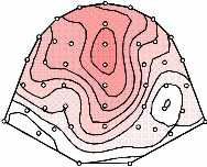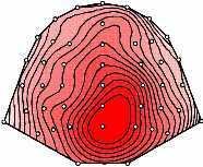 Figure Legend: Potential maps of the effects elicited by the transposed chords (difference ERPs: expected subtracted from transposed chords, view from top, nose is upwards). In the range around 200-320 ms, the early negativity had a maximum over centro-temporal leads of each hemisphere (left). The negativity was followed by a positivity which had a frontal distribution around 350-450 ms (middle-left), and a late positivity from around 500 ms on which was parietally maximal (middle-right). The late negativity was frontally maximal (right).