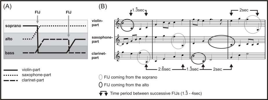 Figure 1B shows an excerpt of a musical stimulus. FIJs occurred in each